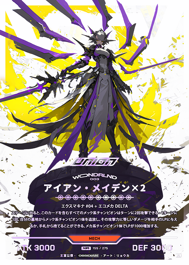 エクスマキナ #04 + エコメカ DELTA ステージに出ると、このカードを含むすべてのメック系チャンピオンはターンに2回攻撃できる • 1ターンに1回、自分の墓地からメック系チャンピオン1体を追放し、その攻撃力に等しいダメージを相手のLPに与えるか、手札から捨てることができる。メカ系チャンピオン1体でLPが1000増加する。