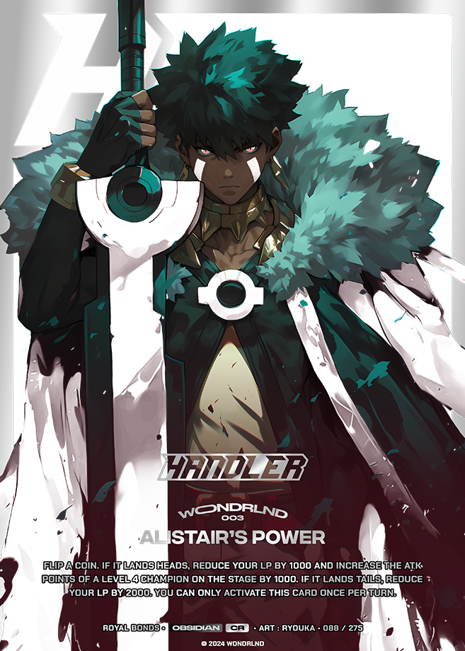 Flip a coin. If it lands heads, reduce your LP by 1000 and increase the ATK points of a level 4 Champion on the stage by 1000. If it lands tails, reduce your LP by 2000. You can only activate this card once per turn.