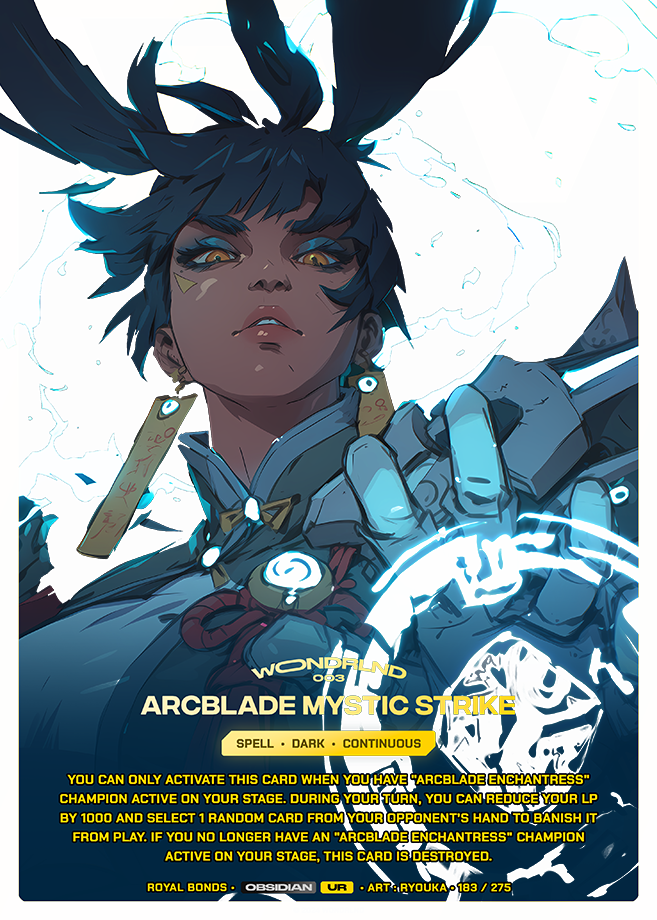 You can only activate this card when you have "Arcblade Enchantress" Champion active on your stage. During your turn, you can reduce your LP by 1000 and select 1 random card from your opponent’s hand to banish it from play. If you no longer have an "Arcblade Enchantress" Champion active on your stage, this card is destroyed.