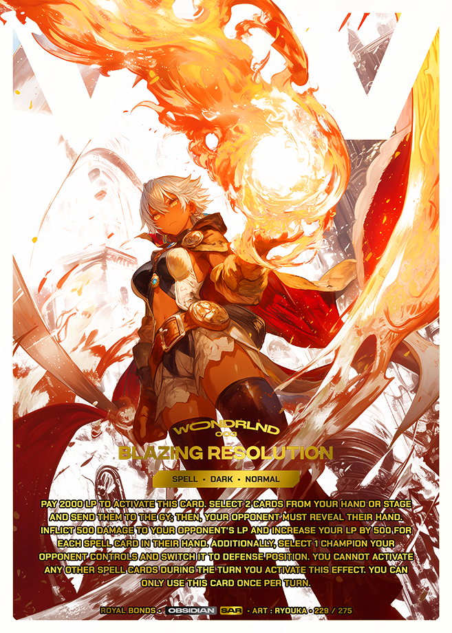 Pay 2000 LP to activate this card. Select 2 cards from your hand or stage and send them to the GY; then, your opponent must reveal their hand. Inflict 500 damage to your opponent's LP and increase your LP by 500 for each Spell card in their hand. Additionally, select 1 Champion your opponent controls and switch it to Defense Position. You cannot activate any other Spell cards during the turn you activate this effect. You can only use this card once per turn.