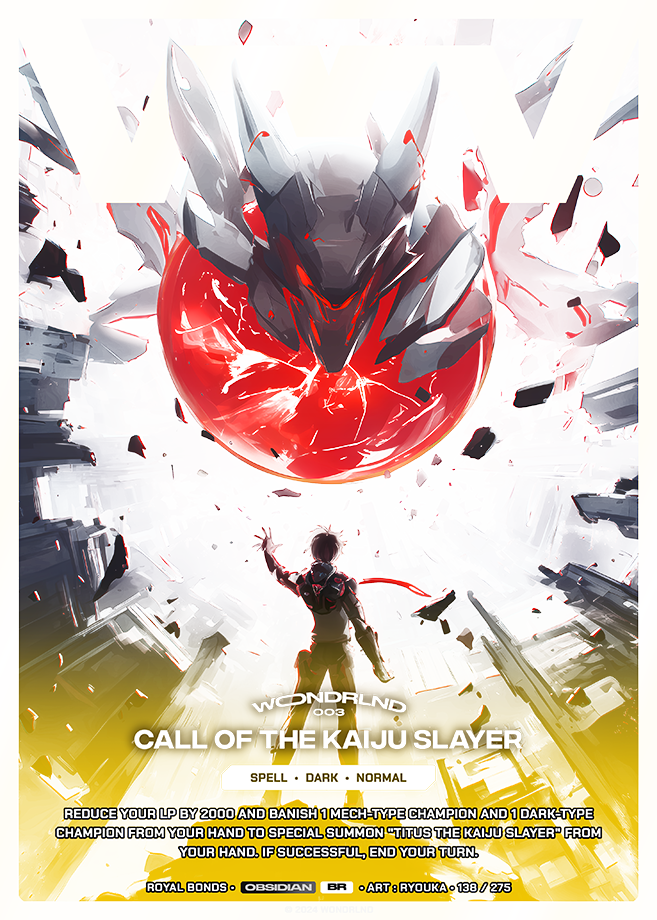 Reduce your LP by 2000 and banish 1 Mech-type Champion and 1 Dark-type Champion from your hand to special summon "Titus the Kaiju Slayer" from your hand. If successful, end your turn.