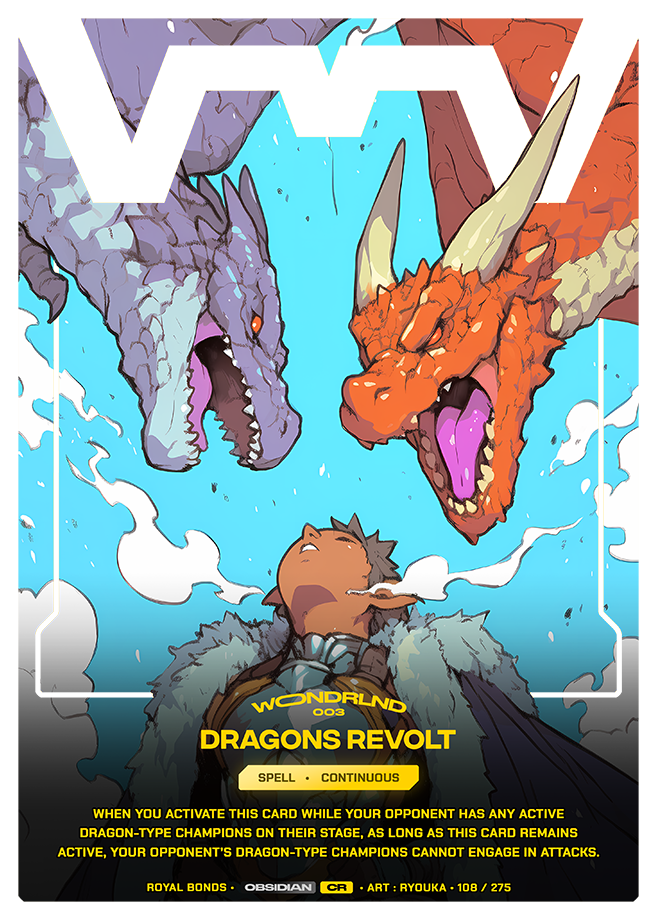 When you activate this card while your opponent has any active Dragon-Type Champions on their stage, as long as this card remains active, your opponent’s Dragon-Type Champions cannot engage in attacks.