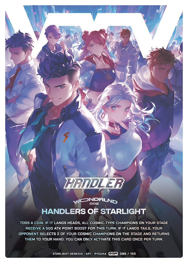 Toss a coin. If it lands heads, all Cosmic-type champions on your stage receive a 500 ATK point boost for this turn. If it lands tails, your opponent selects 2 of your Cosmic champions on the stage and returns them to your hand. You can only activate this card once per turn.