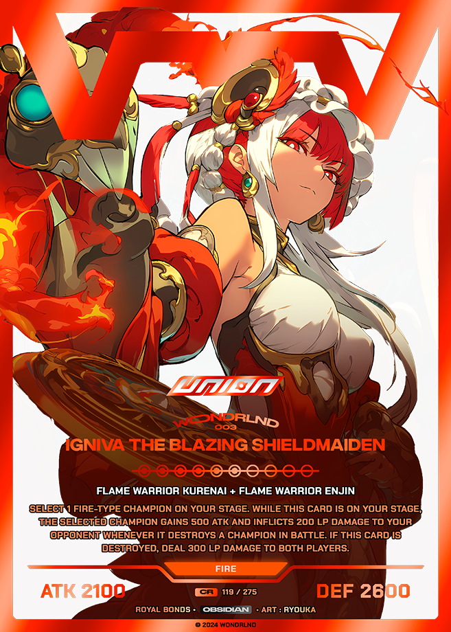 Flame Warrior Kurenai + Flame Warrior Enjin Select 1 Fire-type Champion on your stage. While this card is on your stage, the selected Champion gains 500 ATK and inflicts 200 LP damage to your opponent whenever it destroys a Champion in battle. If this card is destroyed, deal 300 LP damage to both players.