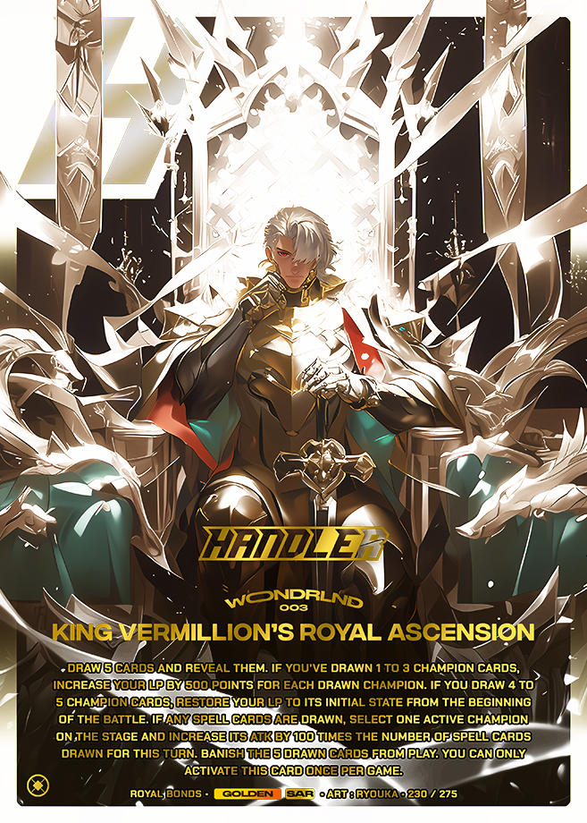 Draw 5 cards and reveal them. If you've drawn 1 to 3 Champion cards, increase your LP by 500 points for each drawn Champion. If you draw 4 to 5 Champion cards, restore your LP to its initial state from the beginning of the battle. If any Spell cards are drawn, select one active Champion on the stage and increase its ATK by 100 times the number of Spell cards drawn for this turn. Banish the 5 drawn cards from play. You can only activate this card once per game.
