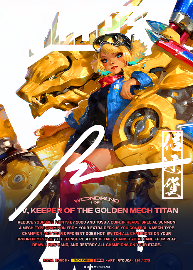 Reduce your life points by 2000 and toss a coin. If heads, special summon a mech-type champion from your extra deck. If you control a mech-type champion and your opponent does not, switch all champions on your opponent's stage to defense position. If tails, banish your hand from play, draw a new hand, and destroy all champions on your stage.