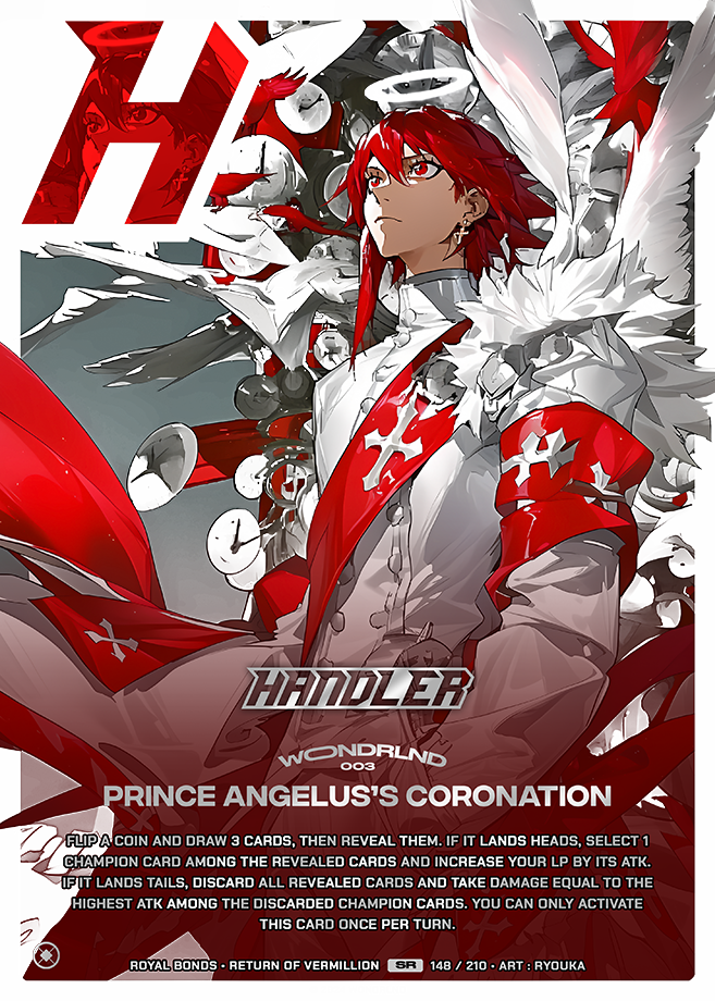 Flip a coin and draw 3 cards, then reveal them. If it lands heads, select 1 Champion card among the revealed cards and increase your LP by its ATK. If it lands tails, discard all revealed cards and take damage equal to the highest ATK among the discarded Champion cards. You can only activate this card once per turn.