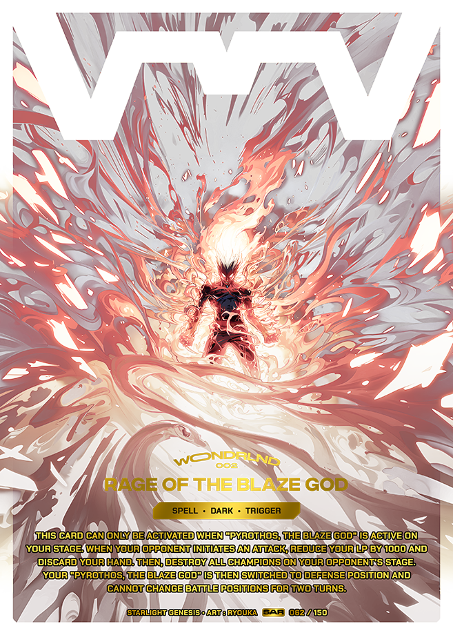 This card can only be activated when "Pyrothos, The Blaze God" is active on your stage. When your opponent initiates an attack, reduce your LP by 1000 and discard your hand. Then, destroy all champions on your opponent's stage. Your "Pyrothos, The Blaze God" is then switched to defense position and cannot change battle positions for two turns.