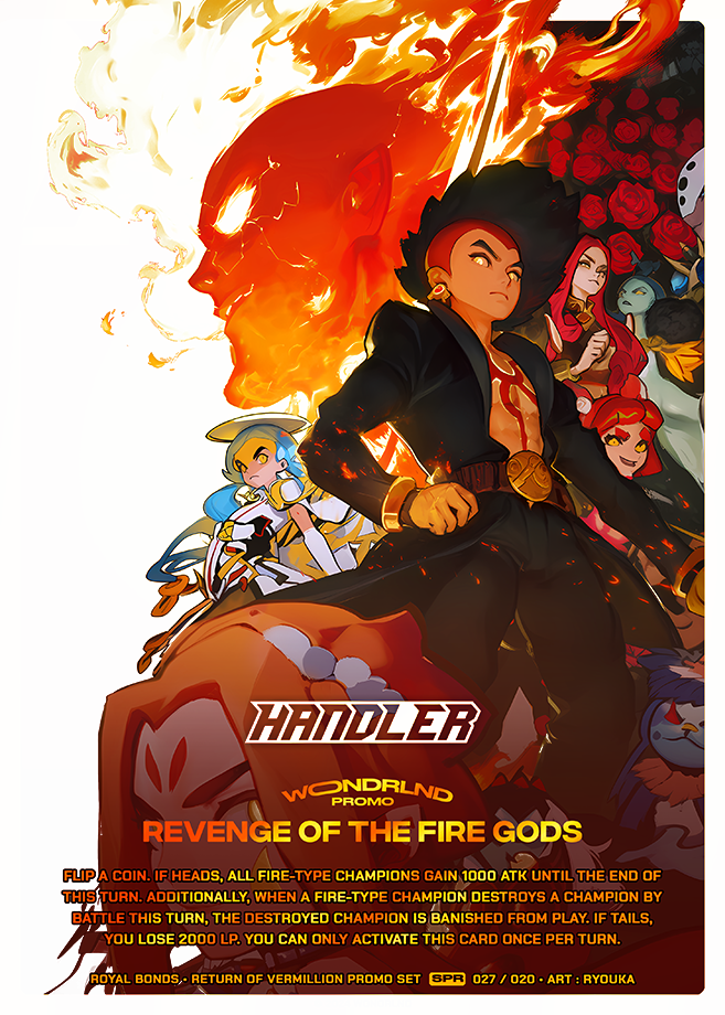 Flip a coin. If heads, all Fire-Type Champions gain 1000 ATK until the end of this turn. Additionally, when a Fire-Type Champion destroys a Champion by battle this turn, the destroyed Champion is banished from play. If tails, you lose 2000 LP. You can only activate this card once per turn.