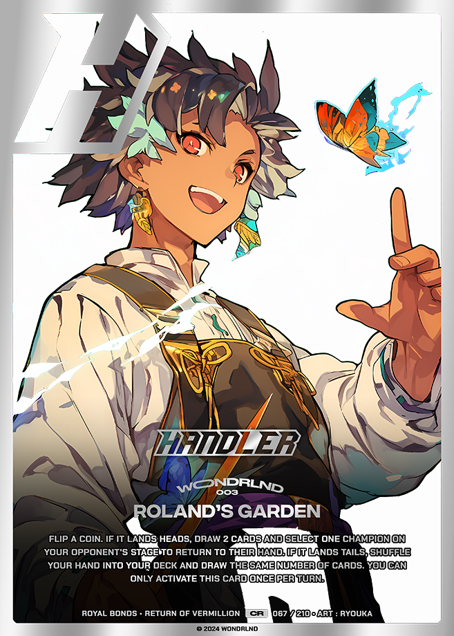 Flip a coin. If it lands heads, draw 2 cards and select one Champion on your opponent's stage to return to their hand. If it lands tails, shuffle your hand into your deck and draw the same number of cards. You can only activate this card once per turn.