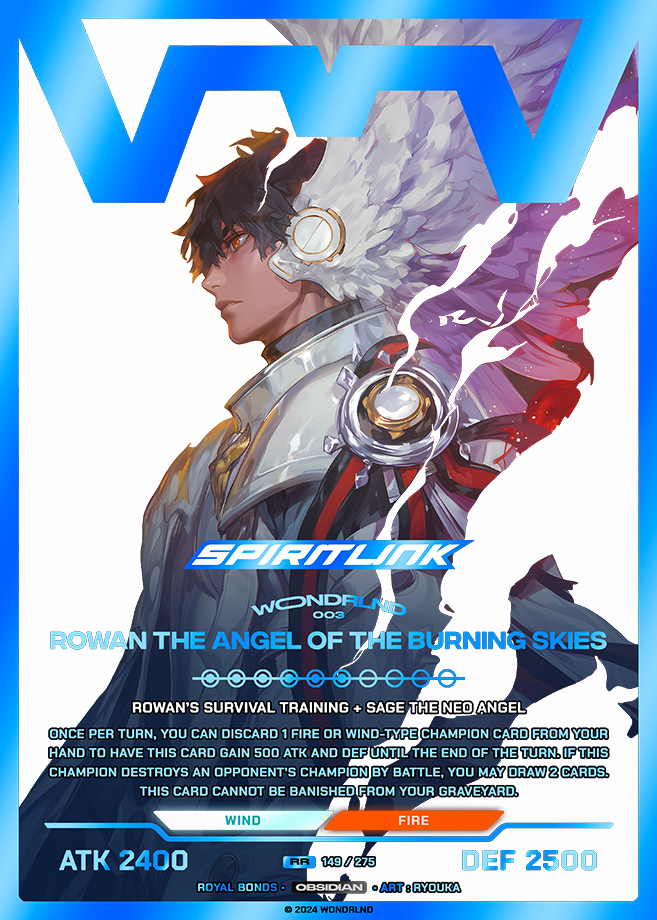 Rowan’s Survival Training + Sage the Neo Angel Once per turn, you can discard 1 Fire or Wind-type Champion card from your hand to have this card gain 500 ATK and DEF until the end of the turn. If this Champion destroys an opponent’s Champion by battle, you may draw 2 cards. This card cannot be banished from your Graveyard.