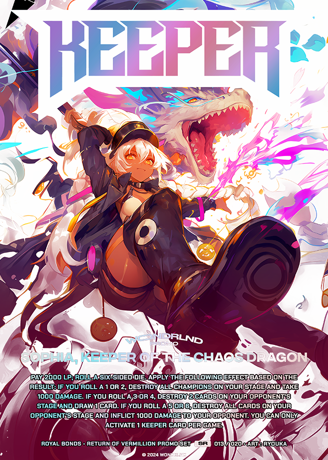 Pay 2000 LP; roll a six-sided die. Apply the following effect based on the result: if you roll a 1 or 2, destroy all Champions on your stage and take 1000 damage. If you roll a 3 or 4, destroy 2 cards on your opponent’s stage and draw 1 card. If you roll a 5 or 6, destroy all cards on your opponent’s stage and inflict 1000 damage to your opponent. You can only activate 1 Keeper Card per game.