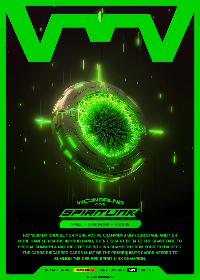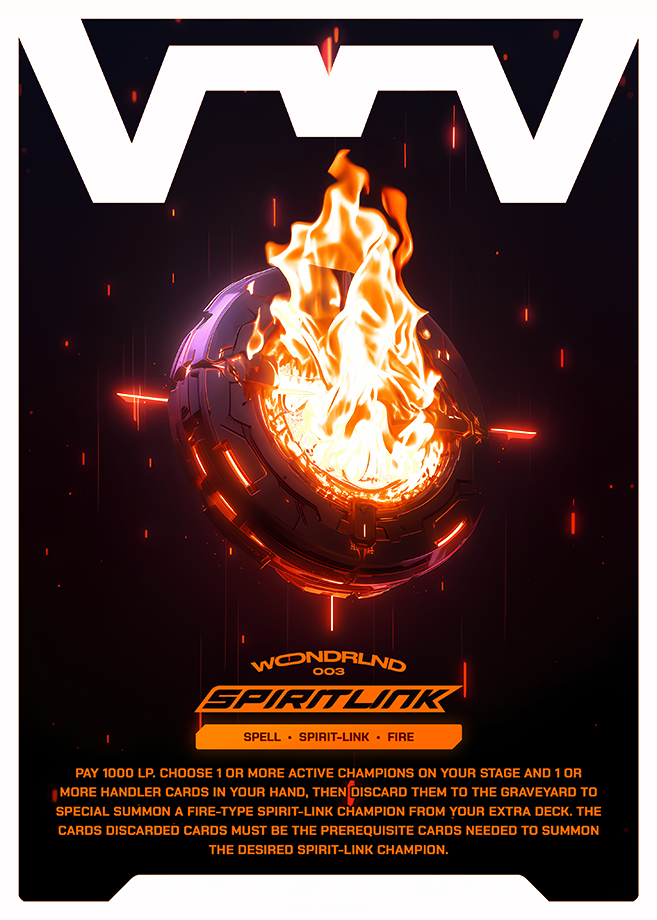 Pay 1000 LP. Choose 1 or more active champions on your stage and 1 or more handler cards in your hand, then discard them to the Graveyard to Special Summon a Fire-type Spirit-Link champion from your Extra Deck. The cards discarded cards must be the prerequisite cards needed to summon the desired Spirit-Link champion.