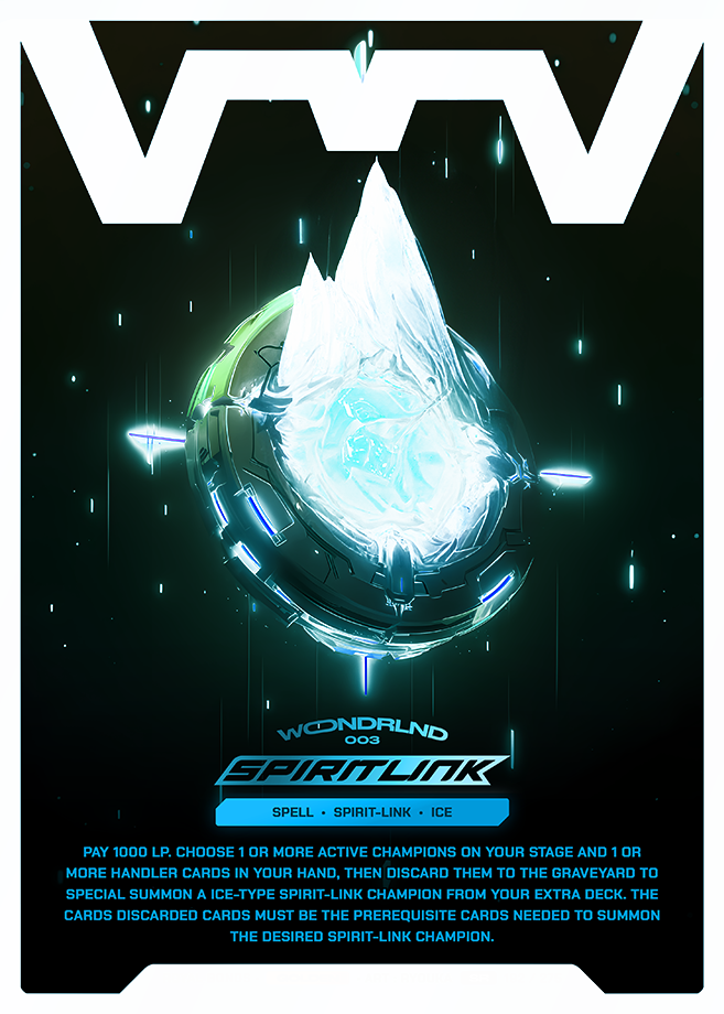 Pay 1000 LP. Choose 1 or more active champions on your stage and 1 or more handler cards in your hand, then discard them to the Graveyard to Special Summon a Ice-type Spirit-Link champion from your Extra Deck. The cards discarded cards must be the prerequisite cards needed to summon the desired Spirit-Link champion.