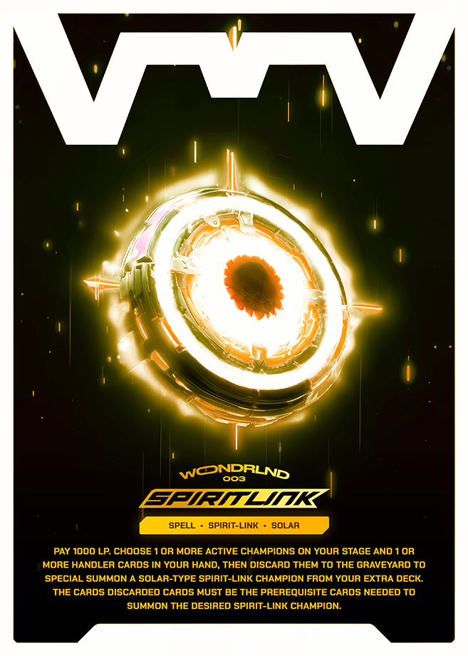 Pay 1000 LP. Choose 1 or more active champions on your stage and 1 or more handler cards in your hand, then discard them to the Graveyard to Special Summon a Solar-type Spirit-Link champion from your Extra Deck. The cards discarded cards must be the prerequisite cards needed to summon the desired Spirit-Link champion.