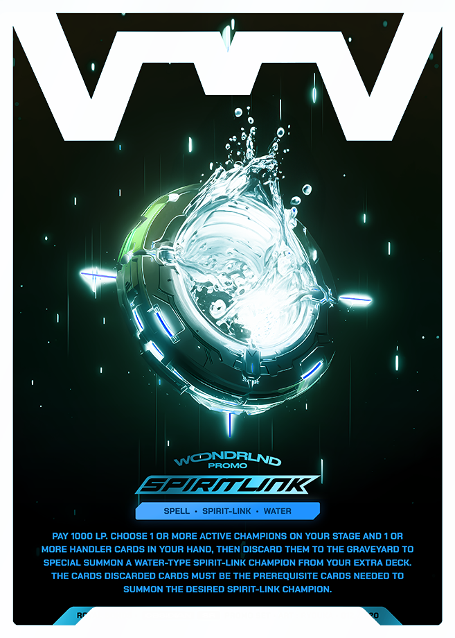Pay 1000 LP. Choose 1 or more active champions on your stage and 1 or more handler cards in your hand, then discard them to the Graveyard to Special Summon a Water-type Spirit-Link champion from your Extra Deck. The cards discarded cards must be the prerequisite cards needed to summon the desired Spirit-Link champion.