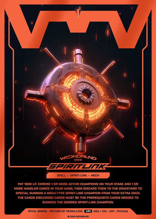 Pay 1000 LP. Choose 1 or more active champions on your stage and 1 or more handler cards in your hand, then discard them to the Graveyard to Special Summon a Wind-type Spirit-Link champion from your Extra Deck. The cards discarded cards must be the prerequisite cards needed to summon the desired Spirit-Link champion.