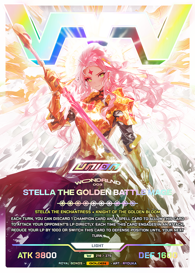 Stella the Enchantress + Knight of the Golden Bloom Each turn, you can discard 1 Champion card and 1 Spell card to allow this card to attack your opponent’s LP directly. Each time this card engages in an attack, reduce your LP by 1000 or switch this card to Defense Position until your next turn.