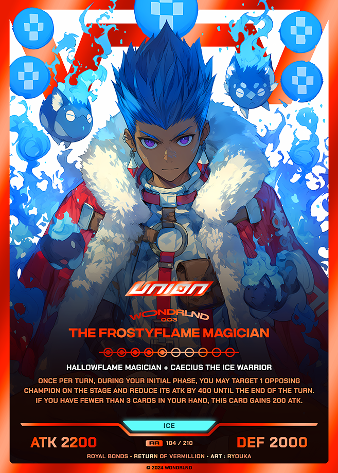 Hallowflame Magician + Caecius the Ice Warrior Once per turn, during your Initial Phase, you may target 1 opposing Champion on the stage and reduce its ATK by 400 until the end of the turn. If you have fewer than 3 cards in your hand, this card gains 200 ATK.