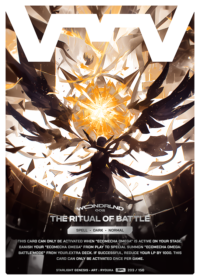This card can only be activated when "Ecomecha Omega" is active on your stage. Banish your "Ecomecha Omega" from play to Special Summon "Ecomecha Omega: Battle Mode" from your Extra Deck. If successful, reduce your LP by 1000. This card can only be activated once per game.