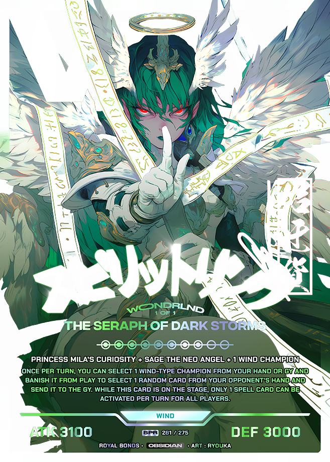 Princess Mila’s Curiosity + Sage the Neo Angel + 1 Wind champion Once per turn, you can select 1 Wind-type Champion from your hand or GY and banish it from play to select 1 random card from your opponent’s hand and send it to the GY. While this card is on the stage, only 1 Spell card can be activated per turn for all players.
