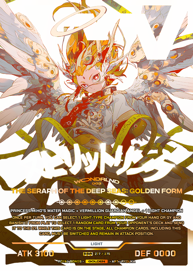 Princess Miho’s Water Magic + Vermillion Guardian Angel + 1 Light champion Once per turn, you can select 1 light-type Champion from your hand or GY and banish it from play to select 1 random card from your opponent’s deck and send it to the GY. While this card is on the stage, all champion cards, including this card, must be switched and remain in attack position.