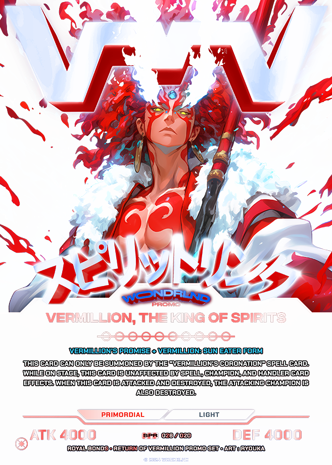 Vermillion’s Promise + Vermillion: Sun Eater form This card can only be summoned by the "Vermillion's Coronation" spell card. While on stage, this card is unaffected by Spell, Champion, and Handler card effects. When this card is attacked and destroyed, the attacking Champion is also destroyed.