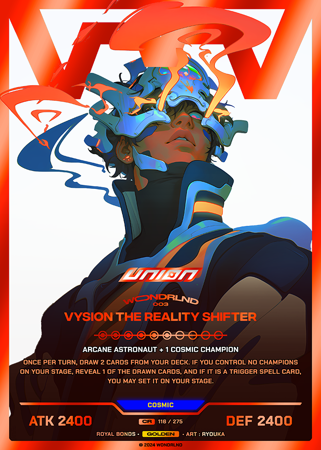 Arcane Astronaut + 1 Cosmic champion Once per turn, Draw 2 cards from your deck. If you control no champions on your stage, reveal 1 of the drawn cards, and if it is a trigger spell card, you may set it on your stage.