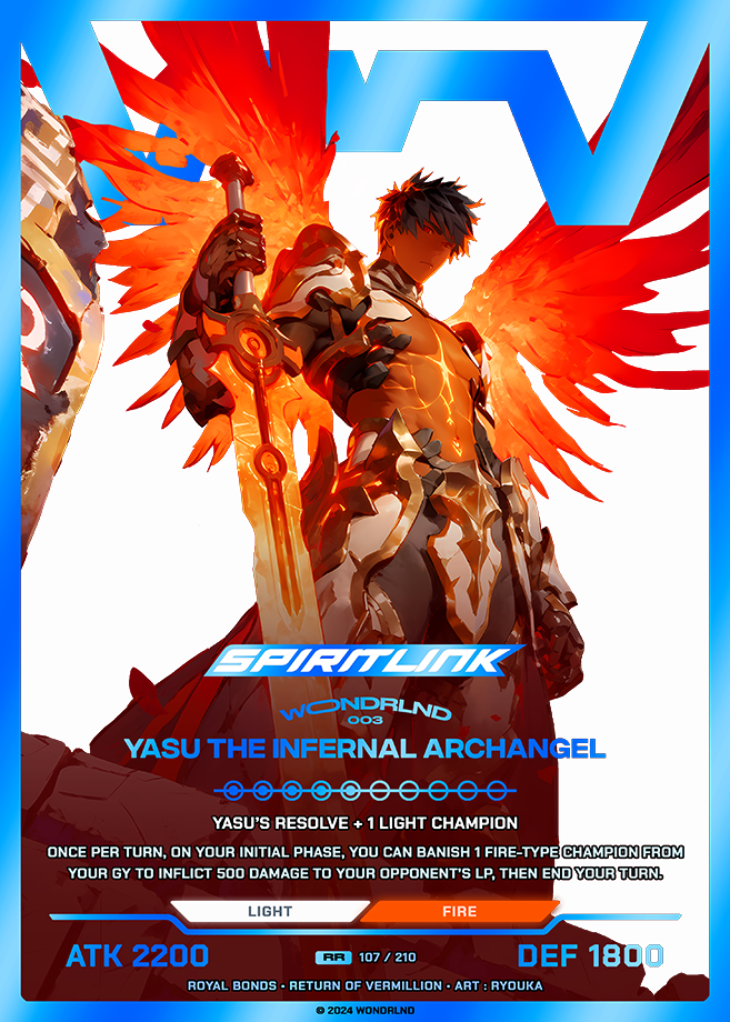 Yasu’s Resolve + 1 Light champion Once per turn, on your initial phase, you can banish 1 fire-type champion from your gy to inflict 500 damage to your opponent’s lp, then end your turn.