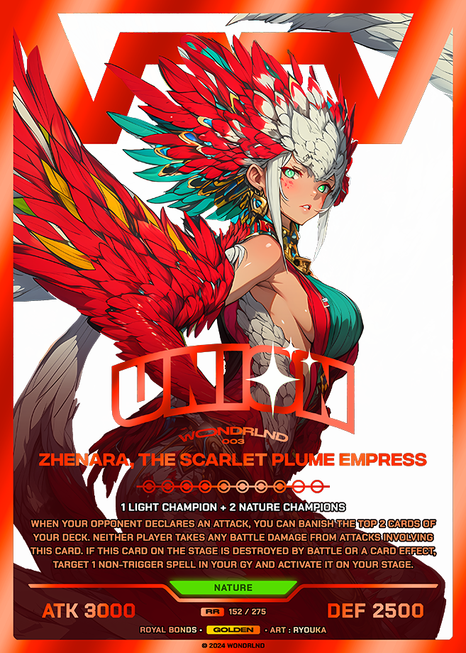 1 Light champion + 2 Nature Champions When your opponent declares an attack, you can banish the top 2 cards of your deck. Neither player takes any battle damage from attacks involving this card. If this card on the stage is destroyed by battle or a card effect, target 1 non-trigger Spell in your GY and activate it on your stage.